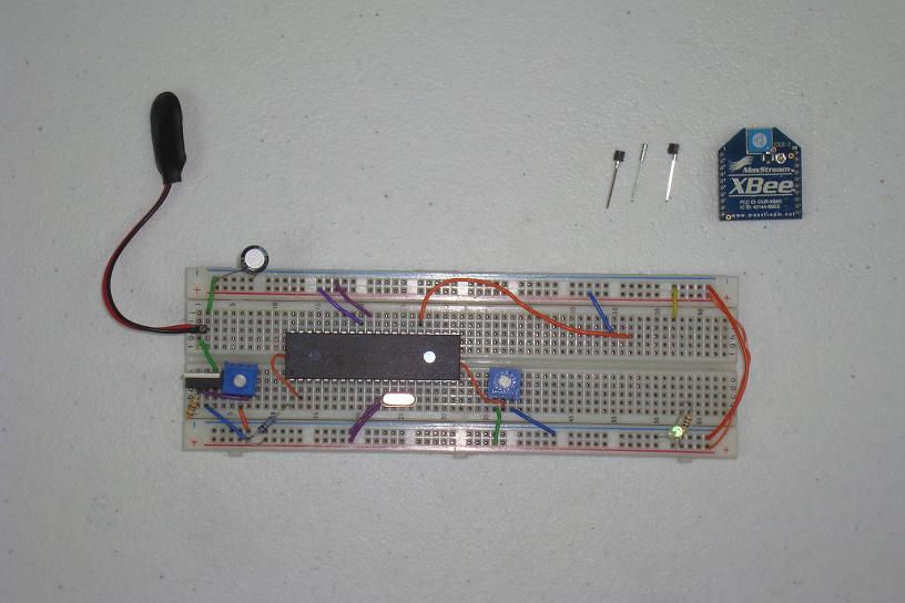 For whatever reason, the Xbee module doesn't used standard 2.54mm (0.1") pitch pins, so it doesn't fit into a breadboard like an IC. To solve this minor issue, I attached 3 SIPs to the Power, Ground and Din pins as you can see in the picture above. After doing that, the Xbee module fits nicely into the breadboard.