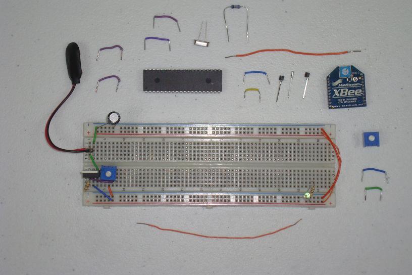 The normal hardware section will be split into two parts. The first part will show you how the transmitter circuit was built on a single breadboard. No tricks, we're just following the schematic here. The second part will show you how the receiver was build, again on a single breadboard, following the schematic.