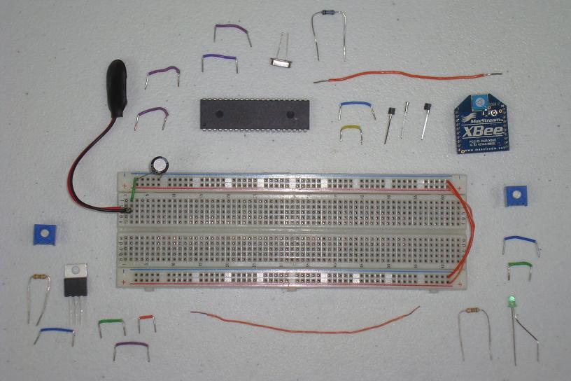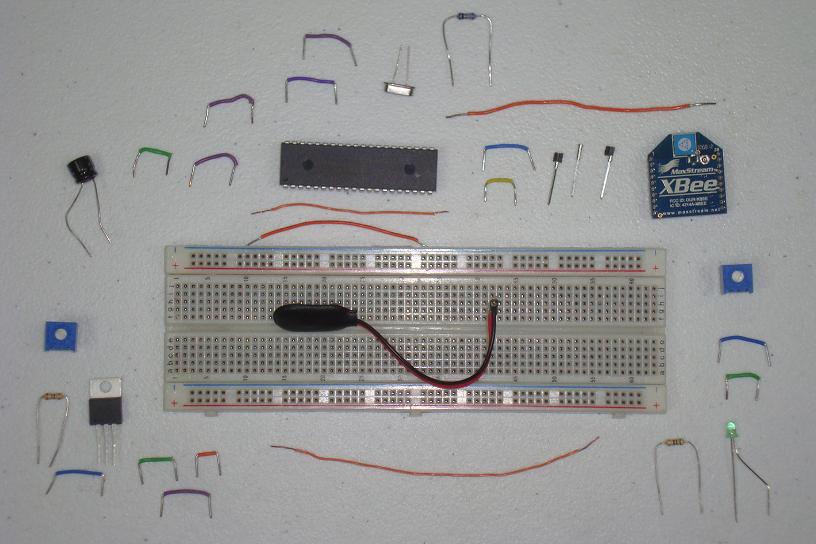 Below, I'll go step by step starting with all the parts laid out and then connect them together on the breadboard section by section until the transmitter is complete. In the pictures below you can see all the parts used for the transmitter: