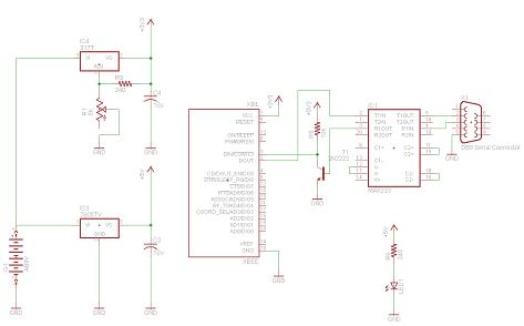 The power regulation circuit is a LM7805 +5v regulator that will convert the +9v from the battery to a steady +5v output to the MAX233a. A LM317 variable regulator is also used to regulate down to +3.3v for the level shifter and to power the XBee module.