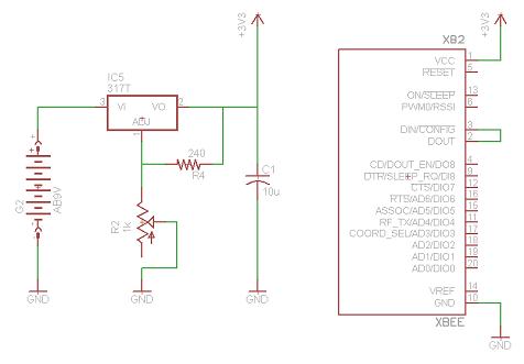 The power regulation circuit is a LM317 variable regulator that will convert the +9v from the battery to a steady +3.3v output to the XBee. A variable resistor is used to set the exact voltage output to the +3.3v we want.