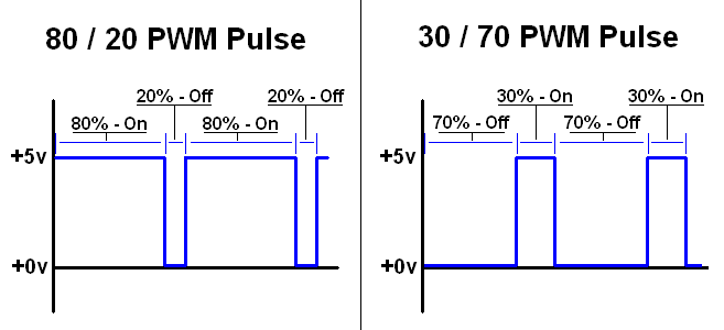 The two images above show you two different PWM signals. The first signal is "on" 80% of the time. That means it is at +5v for 80% of the period of the signal. This is a powerful signal and it would make a motor run very fast. The second image shows you a signal similar to the first, but it is only on 30% of the time. It is at +0v for 70% of the period of the signal. Since this PWM signal is in an 'off' state for the majority of the time, it would make a motor run much slower than the first PWM.