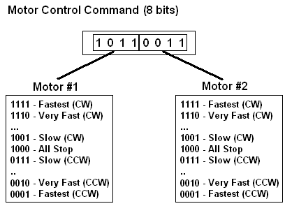 Each successful transmission using the XBee modules will consist of 8 bits of data. To make this system as beginner friendly as possible a super simple command structure was built for telling the receiver PIC how to control the motors. Each direction CW - Clockwise, CCW - Counter-Clockwise, has 7 speed settings from 001 to 111.