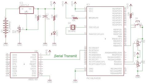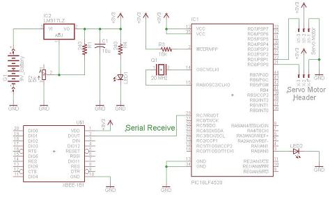 There are two schematics for this project, one for the transmitter and one for the receiver. The transmitter is fairly simple, and the receiver is a little more complicated. The main parts in the schematic are the PIC 18LF4520, XBee Modules and HS-485 Servos.